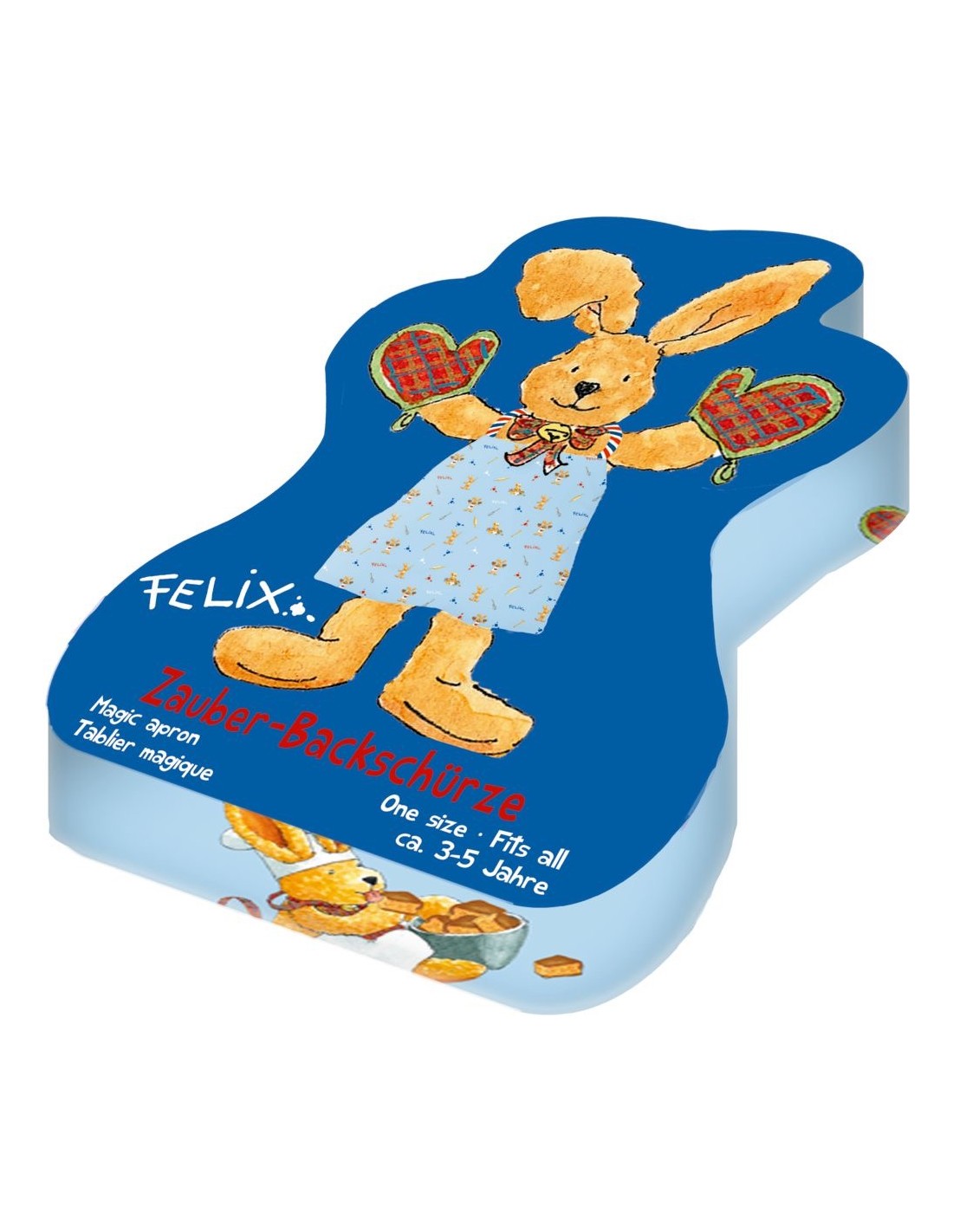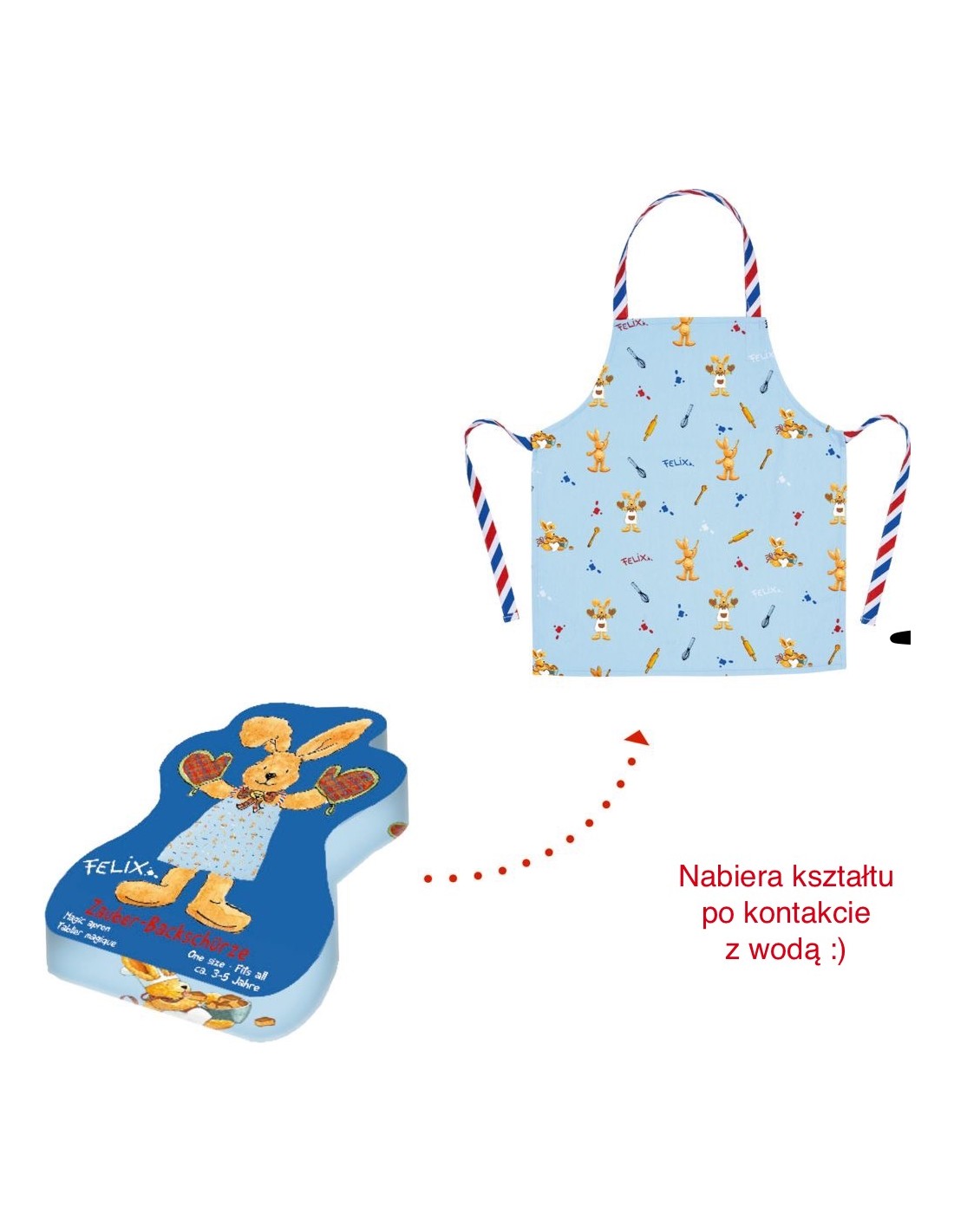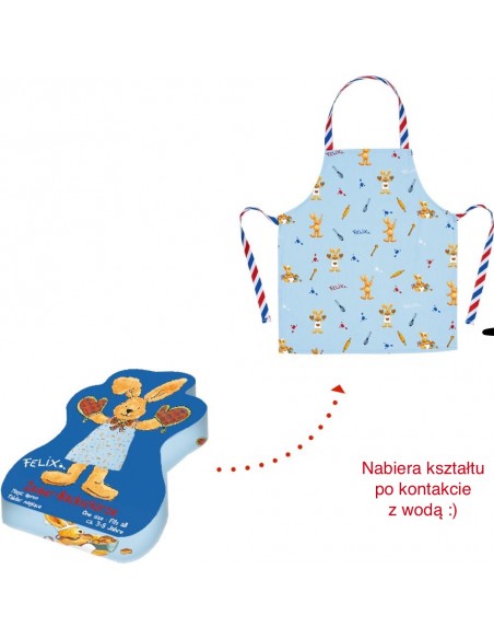 Ten magiczny fartuch kuchenny z kolorowymi motywami ze świata Zająca Feliksa jest w sprasowanej formie i rozwija się jak za dotknięciem czarodziejskiej różdżki do pełnego rozmiaru, gdy tylko zetknie się z wodą. Wtedy jest gotowy na kolejną kulinarną przygodę! Gwarantowany zachwyt w oczach maluchów!